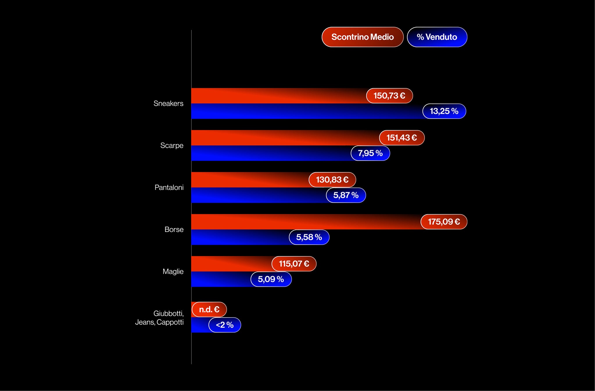Sneakers 13,25% | scontrino medio €150,73 — Scarpe 7,95% | scontrino medio €151,43 — Pantaloni 5,87% | scontrino medio €130,83 — Borse 5,58% | scontrino medio €175,09 — Maglie 5,09% | scontrino medio €115,07 — Giubbotti, jeans, cappotti <2% | scontrino medio n.d.